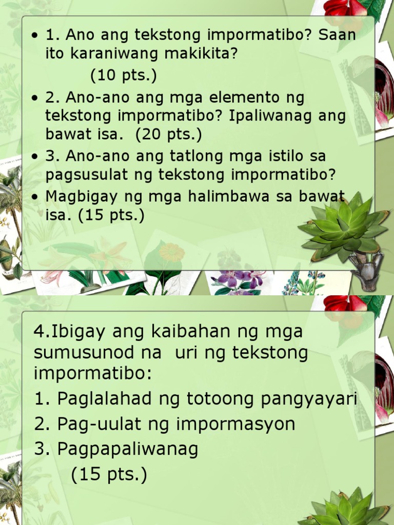 Tumutugon ang mga ganitong akda sa tanong na bakit. Talaan ng nilalaman 2. Masasabi ring ang tekstong impormatibo ay hindi nagbibigay ng opinyong pabor o.