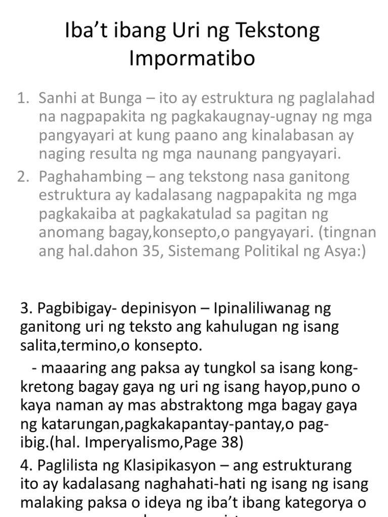 Impormatibo Deskriptibo Persuweysib Naratibo Argumentatibo Prosidyural. Ito ay may laman na tiyak na impormasyon sa isang pangalan. A Sanhi at Bunga - ito ay estruktura ng paglalahad na nagpapakita ng pagkaka-ugnay ng mga pangyayari at kung paanong ang kinalabasan ay naging resulta ng mga naunang pangyayari.